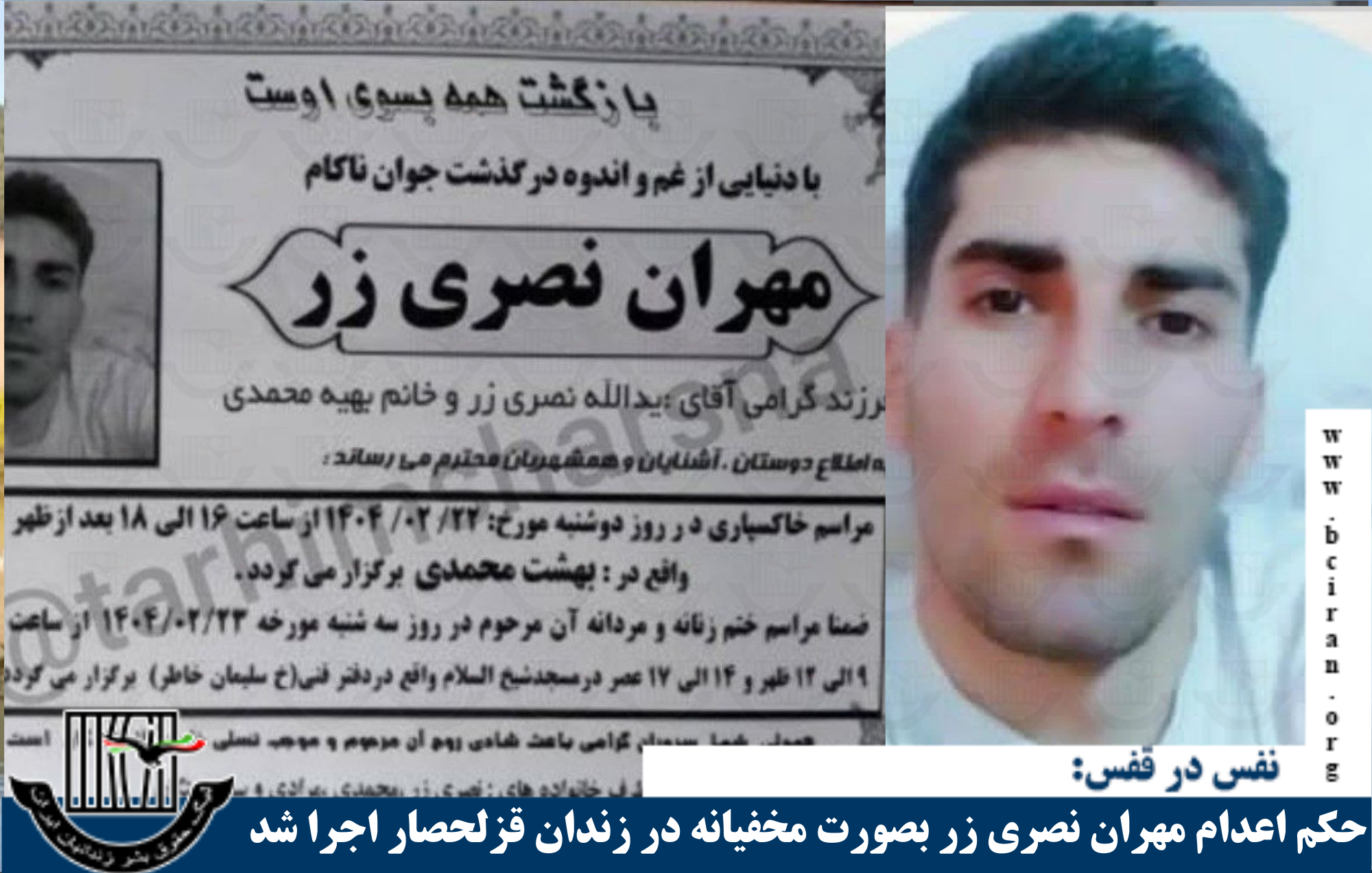 نفس در قفس –پنجشنبه ۲۵ اردیبهشت ۱۴۰۴ سحرگاه امروز، پنجشنبه ۲۵ اردیبهشت ۱۴۰۴، حکم اعدام دستکم یک زندانی که به اتهام «قتل» بازداشت و به اعدام محکوم شده بود. در زندان مرکزی مشهد به اجرا درآمد. به گزارش «نفس در قفس»، ارگان خبری لیگ حقوق بشر زندانیان ایران، بامداد امروز، پنجشنبه ۲۵ اردیبهشت یک زندانی، […]
