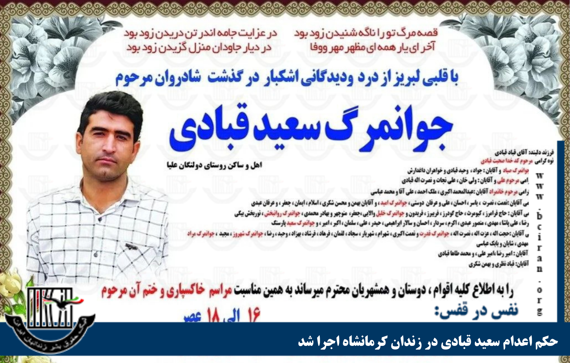 نفس در قفس، ۲۶ آبان ۱۴۰۲: سحرگاه سهشنبه ٢٣ آبان ماه ۱۴۰۲، حکم اعدام یک زندانی به نام شهباز لطیفی سرینی در زندان مرکزی شهر کرمانشاه به اجرا در آمد. این زندانی پیشتر به اتهام قتل عمد به اعدام محکوم شده بود. به گزارش سازمان حقوق بشری ههنگاو، سحرگاه سهشنبه ٢٣ آبان ماه، حکم اعدام […]