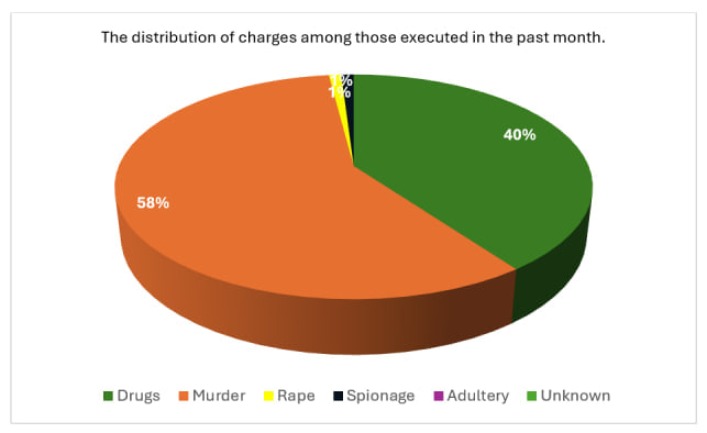 The geographical distribution of executions, indicates that after Shiraz and Karaj, the cities of Isfahan, Rasht, and Khorramabad rank next and account for a significant proportion of executions in the past month. This pattern reflects a concentration of executions in specific provinces that play a central role in the government’s execution-centred policy.