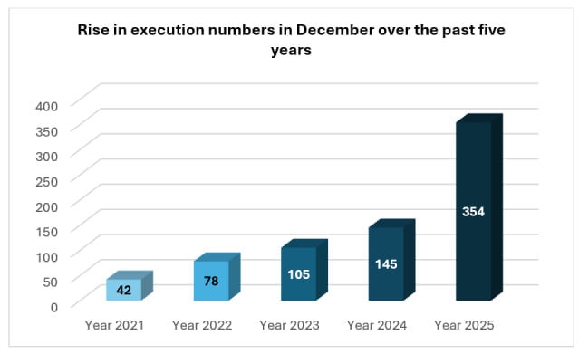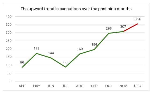 Between 20 November and 20 December 2025, a total of 354 executions were recorded. This represents an increase of approximately 144% compared with the same period in 2024, during which 145 executions were documented. In concrete terms, the number of executions in this month has more than doubled, marking the most severe year-on-year surge in executions for this period in at least the past four years.